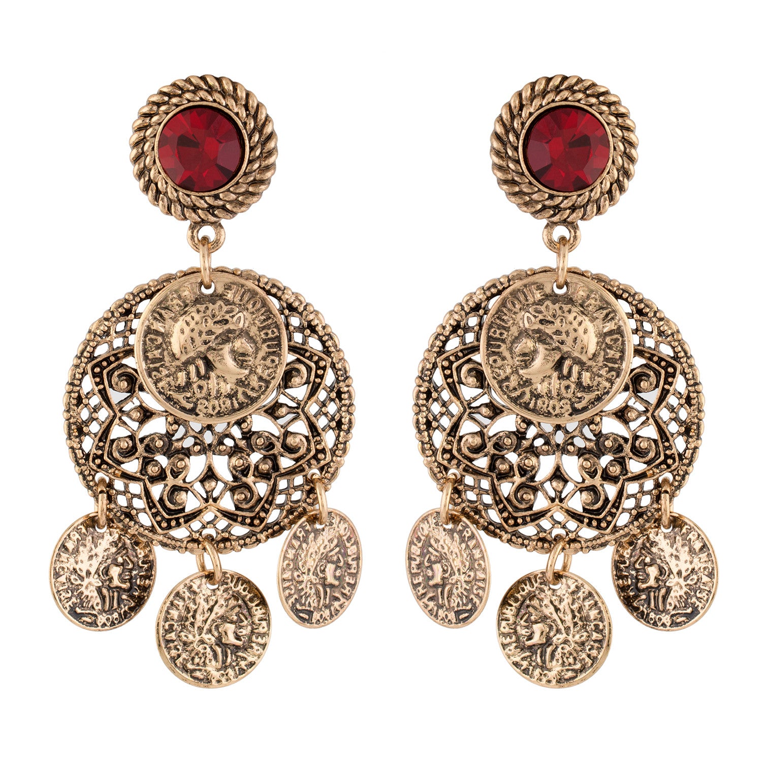 Oxide gold colour danglers are smartly crafted from alloy and studded red stone. It can be put on with the western as well as ethnic wear. One must do try them. It is a special piece for the special parties like DJ or Cocktail Parties.